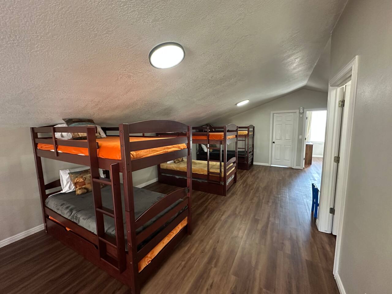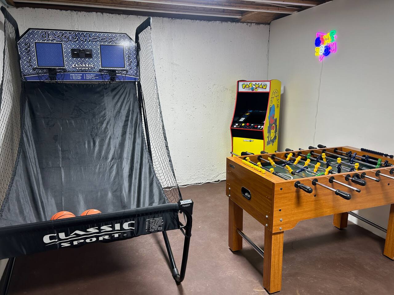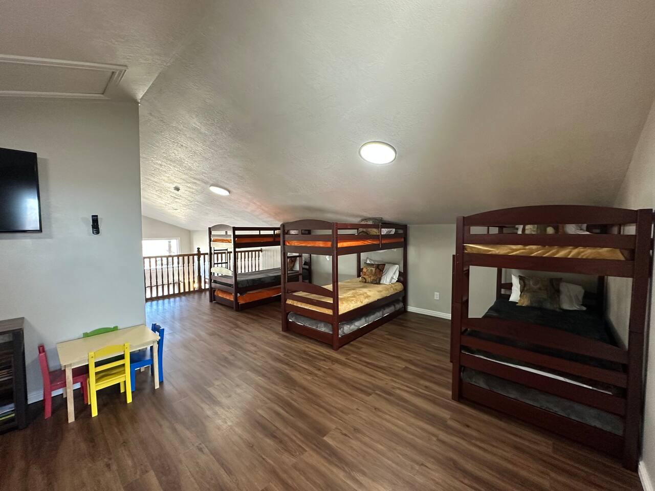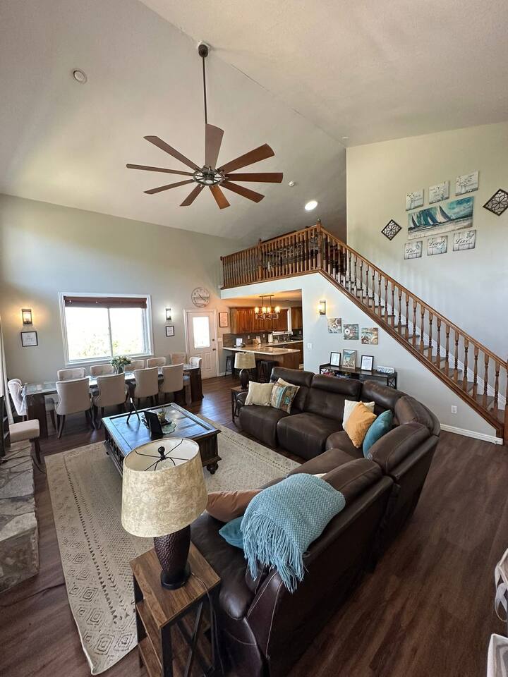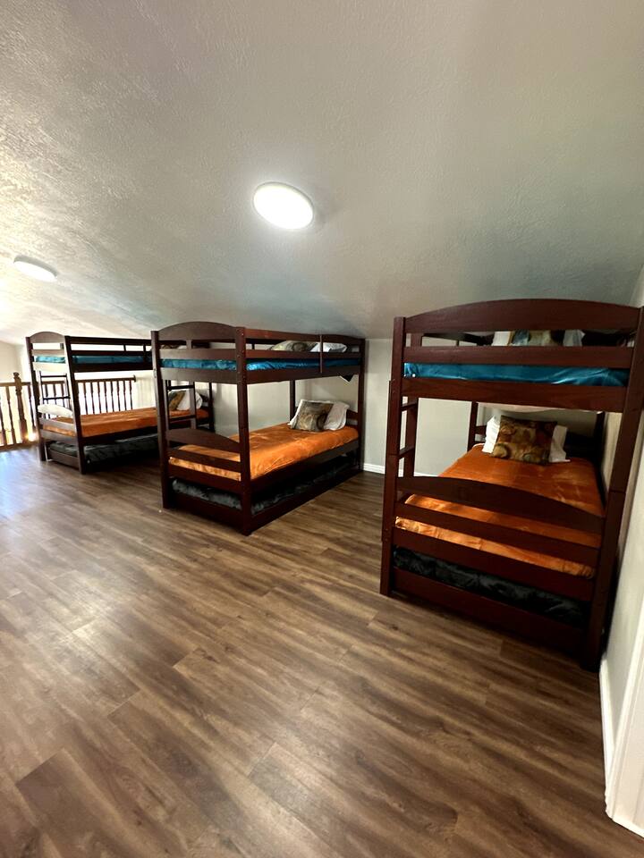 This home is built for connection and fun, thoughtfully designed to host family reunions with up to 4 families for an unforgettable reunion or gathering. The main level features a bright, open-concept living space where the living room, large dining area, and fully stocked kitchen come together—perfect for preparing and enjoying family meals. The upper-level living area features a second living room with a dedicated kids’ area, creating a comfortable space for play and downtime. This level also includes bunk beds, two bedrooms —each with queen size beds and TV its own air-conditioning unit for added summer comfort—and a shared bathroom. The basement completes the experience with a game room area featuring arcade games, foosball table, and basketball game for hours of fun. KEY FEATURES & AMENITIES: * Wraparround deck with beautiful lake views * BBQ grill and outdoor dining area * Charming gazebo with string lights and a fire pit * Game room with arcade machines and foosball and basketball games * Dedicated work desk for remote needs * Children's area with books and toys * Crib and baby safety gates available * Two large water heaters to ensure plenty of hot water for everyone SLEEPING ARRANGEMENTS (Sleeps 19): * First Floor Suite 1: 1 Queen Bed and TV (Sleeps 2) * First Floor Suite 2: 1 Queen Bed and TV (Sleeps 2) * First Floor Suite 3: 1 Queen Bed and TV (Sleeps 2) * Second Floor Bedroom 4: 1 Queen Bed and TV (Sleeps 2) * Second Floor Bedroom 5: 1 Queen Bed and TV (Sleeps 2) * Second Floor Loft: 3 Triple Bunk Beds (9 twin beds total) with a shared bathroom (Sleeps 9)